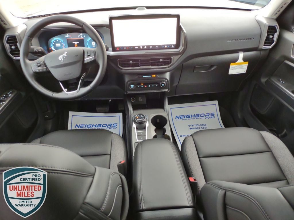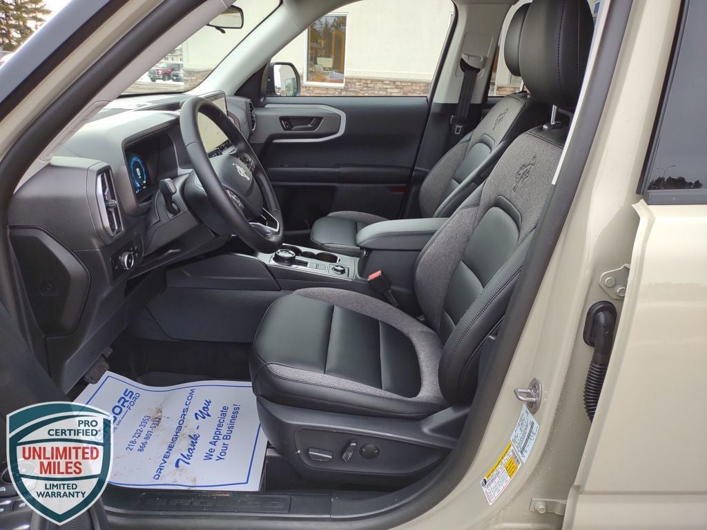 Neighbors Ford Of Park Rapids is proud to offer this great 2025 Ford Bronco Sport Big Bend in Desert Sand, Beautifully equipped with Black Appearance Package (Carbon Black Grille w/Black BRONCO Lettering, Cargo Mat, Front & Rear Floor Liners w/o Carpet Mats, Front Driver/Passenger Seat Back Map Pockets, Liftgate w/Black BRONCO SPORT Lettering, Painted Shadow Black Roof, Premium Trimmed Htd Fr Sport Contour Bucket Seats, and Wheels: 17 Matte Black-Painted Aluminum), Convenience Package (Heated 8-Way Power Driver's Seat, LED Fog Lamps, Premium Wrapped Steering Wheel, and Universal Garage Door Opener (UGDO)), Equipment Group 200A, 4-Wheel Disc Brakes, 6 Speakers, ABS brakes, Air Conditioning, Alloy wheels, AM/FM radio: SiriusXM, AM/FM Stereo, Auto High-beam Headlights, Automatic temperature control, Brake assist, Cloth w/Easy-to-Clean Front Bucket Seats, Compass, Delay-off headlights, Driver door bin, Driver vanity mirror, Dual front impact airbags, Dual front side impact airbags, Electronic Stability Control, Emergency communication system: SYNC 4 911 Assist, Four wheel independent suspension, Front & Rear Splash Guards, Front anti-roll bar, Front Bucket Seats, Front Center Armrest, Front License Plate Bracket, Front reading lights, Fully automatic headlights, Heated door mirrors, Illuminated entry, Knee airbag, Low tire pressure warning, Occupant sensing airbag, Outside temperature display, Overhead airbag, Overhead console, Panic alarm, Passenger door bin, Passenger vanity mirror, Power door mirrors, Power steering, Power windows, Radio data system, Rear anti-roll bar, Rear Parking Sensors, Rear reading lights, Rear seat center armrest, Rear window defroster, Rear window wiper, Remote keyless entry, Security system, SiriusXM, Speed control, Speed-sensing steering, Speed-Sensitive Wipers, Split folding rear seat, Steering wheel mounted audio controls, SYNC 4 w/Enhanced Voice Recognition, Tachometer, Telescoping steering wheel, Tilt steering wheel, Traction control, Trip computer, Variably intermittent wipers, and Wheels: 17 Carbonized Gray-Painted Aluminum! Price does not reflect state taxes and registration. $2000 - Retail Customer Cash. Exp. 03/31/2026 $500 - Bonus Customer Cash. Exp. 03/31/2026