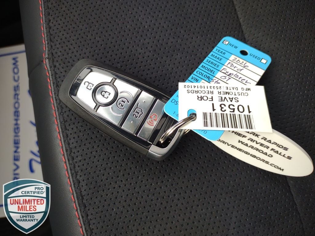 Neighbors Ford Of Park Rapids is delighted to offer this wonderful 2026 Ford Explorer ST in Star White Metallic Tri-Coat, Beautifully equipped with Equipment Group 400A Standard Package (Heated/Ventilated Miko Suede Captain's Chairs, Radio: B&O Sound System by Bang and Olufsen, and Wheels: 21 Magnetite-Painted Aluminum), Sun and Sound Package (Multicontour Seats with Front Active Motion, Panoramic Fixed Glass Roof with Power Shade, Radio: B&O Sound System by Bang & Olufsen, and Remote Control Front Windows), 10 Speakers, 3rd row seats: bench, 4-Wheel Disc Brakes, ABS brakes, Air Conditioning, Alloy wheels, AM/FM radio: SiriusXM with 360L, Apple CarPlay/Android Auto, Auto High-beam Headlights, Auto-dimming door mirrors, Auto-dimming Rear-View mirror, Automatic temperature control, Brake assist, Bumpers: body-color, Compass, Delay-off headlights, Driver door bin, Driver vanity mirror, Dual front impact airbags, Dual front side impact airbags, Electronic Stability Control, Emergency communication system: 911 Assist, Engine Block Heater, Exterior Parking Camera Rear, Four wheel independent suspension, Front and 2nd Rows Floor Liners with Carper Floor Mats, Front anti-roll bar, Front Bucket Seats, Front Center Armrest, Front dual zone A/C, Front fog lights, Front License Plate Bracket, Front reading lights, Fully automatic headlights, Garage door transmitter, Heated door mirrors, Heated front seats, Heated rear seats, Heated steering wheel, Illuminated entry, Knee airbag, Leather steering wheel, Low tire pressure warning, Memory seat, Navigation System, Occupant sensing airbag, Outside temperature display, Overhead airbag, Overhead console, Panic alarm, Passenger door bin, Passenger vanity mirror, Power door mirrors, Power driver seat, Power Liftgate, Power passenger seat, Power steering, Power windows, Rain sensing wipers, Rear air conditioning, Rear anti-roll bar, Rear reading lights, Rear window defroster, Rear window wiper, Remote keyless entry, SecuriCode Keyless Entry Keypad, Security system, Speed control, Speed-sensing steering, Speed-Sensitive Wipers, Split folding rear seat, Spoiler, Sport steering wheel, Steering wheel mounted audio controls, Tachometer, Telescoping steering wheel, Tilt steering wheel, Traction control, Trip computer, Turn signal indicator mirrors, Variably intermittent wipers, and Ventilated front seats! Price does not reflect state taxes and registration. $3500 - Retail Customer Cash. Exp. 03/31/2026 Must be 2016 or newer and less than 150k miles